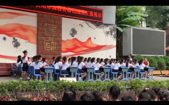 (一)首先三年级二班的同学表演了《请党放心,强国有我》的合唱情景剧,同学们稚嫩的声音唱出了对祖国的热爱,情景剧生动的展现了革命战争年代,女战士们的飒爽英姿。