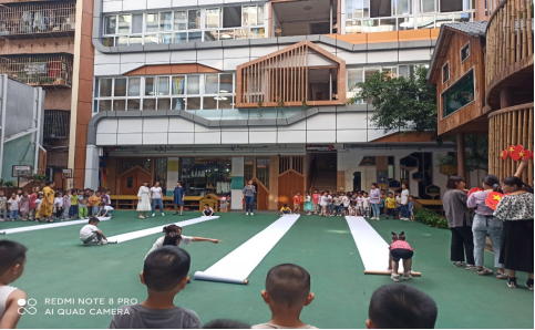 这是长画卷,小朋友们可以在上面创造性的作画,表达自己对祖国的热爱之情,虽然后来因为下雨,长画卷是在教室完成的,但是每个小朋友都充分发挥了自己的想象力,有的小朋友画了天安门,有的小朋友画了各种形状的太阳,还有的小朋友画了蛋糕,小朋友们通过自己的创造共同画出了长长的卷轴画。