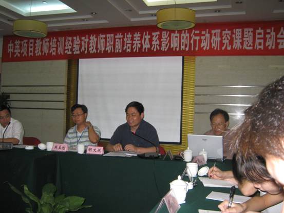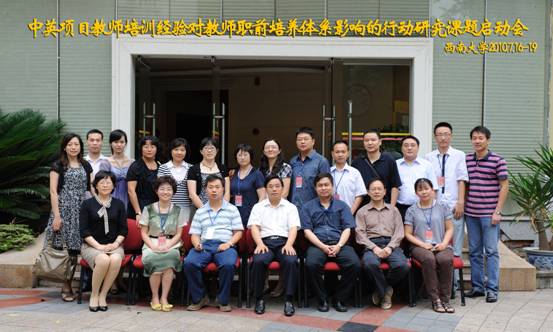 2010年7月17至18日,由西南大学、广西师范大学、云南师范大学、四川师范大学、贵州师范大学、广西师范学院、长江师范学院、宜宾学院、大理学院、成都大学等10所院校联办,西南大学承办的“中英西南基础教育项目教师培训经验对职前教师培养影响的行动研究”启动会在重庆市莱特酒店召开,本次会议的重点是研究如何将中英西南基础教育项目五年在教师培训方面所取得的经验有效转变成为大学师范生的培养资源,从而对教师职前培养产生积极影响。会议经过两天的研讨,达成了重要的共识,取得了圆满的成功。