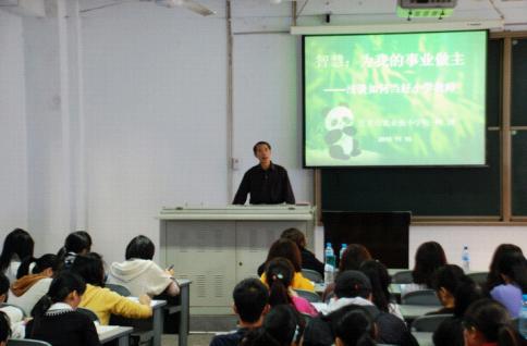 为了加深小学教育专业学生对本专业的认识,强化和巩固专业思想,让该专业学生更真实了解目前宜宾市小学教育的现状, 2010年11月10日下午,教师教育学院小学教育教研室特邀宜宾市农业街小学校长何涛、教导主任姜倩分别以“智慧:我的事业我做主——浅谈如何当好小学教师”、“我愿做一名小学语文教师——漫谈小学语文教师素质要求”为题,为我院小学教育专业学生进行了专题讲座。两位专家从小学教师应有的专业理念、专业素质入手,深入浅出地对小学教师专业化发展进行了精彩分析。广大同学专心听讲、细心记录,并不时对专家的精彩讲解报以阵阵掌声。