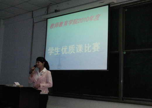 2010年5月12日下午,教师教育学院2010年度学生优质课比赛在第一教学楼201举行。参加比赛的共有来自2007级1班、2008级1班和2008级4班的13名选手。参赛的题目涉及中学语文、中学英语、小学语文及幼儿园教学等。担任评委工作是教师教育教研室、小学教育教研室、学前教育教研室的部分教师。经过四个小时的激烈比赛,最后评出一等奖2名、二等奖3名、三等奖8名,他们分别是: