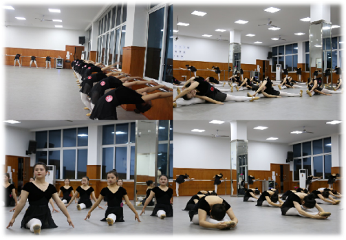 首先是基本功的训练展示,由19级5.6.7班分组进行软开度的训练展示,促进同学们身体的控制能力、稳定性,让形体更挺拔修长。