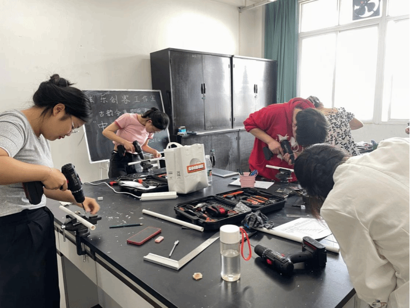 活动过程中,先由牟洁老师展示自己提前制作的F调横笛,并讲解横笛的构成部分、横笛制作先后步骤、图纸上的结构和标注以及各种工具使用时的注意事项。其次,社团成员们带着好奇心与热情积极参与到横笛制作的实践中,在老师的耐心指导下制作管身部分。在切割pvc管的过程中,不少同学遇到了问题,牟老师耐心给同学们示范、操作并讲解其中的技巧;借助工作室的工具,同学们的钻孔效率非常高。通过自己的动手制作和老师们的耐心指导,同学们很快就制作出了一根属于自己的中国横笛。这次活动用简单、低成本材料,制作简易的吹管乐器,使同学在实际操作中有所感,在感悟中有所进步。