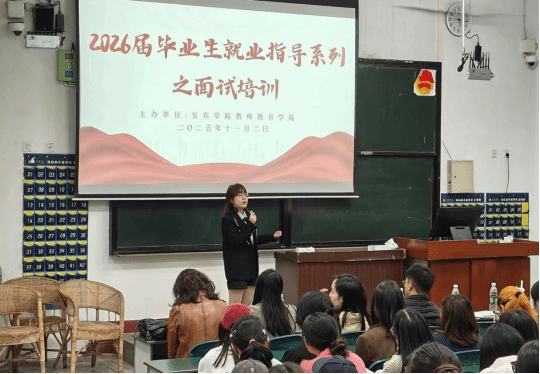 为切实提升2026届毕业生的面试能力,助力其在就业竞争中脱颖而出,2025年11月2日,宜宾学院教师教育学院在A区硕勋楼A201举办了“2026届毕业生就业指导系列之面试培训”活动。教师教育学院党委副书记唐辉、毕业班辅导员沈文静、王勤、李佳欣、谢涛与三百余名毕业生共同参与此次培训会。