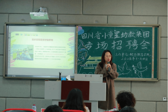为深入贯彻落实党中央、国务院关于高校毕业生就业工作的决策部署,积极搭建毕业生与用人单位双向选择平台,助力毕业生高质量就业,宜宾学院教师教育学院于2025年11月4日在A区博雅楼B201成功举办四川省小童星幼教集团专场招聘会。集团HR总监苏勤、成都市栢基PYP幼儿园园长袁伟俪及业务园长付瑞华莅临宣讲,教师教育学院党委副书记唐辉、学工办主任沈文静、学工办副主任王勤和毕业班辅导员李佳欣,与百余名毕业生共同参与此次招聘会。