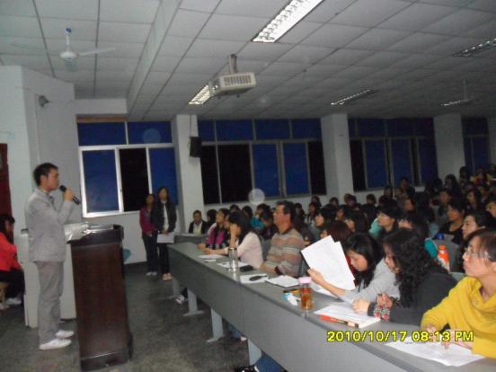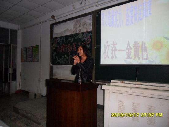 2010年10月17日晚上7:30,教师教育学院在一教楼202教室隆重举行2011届优秀大学毕业生事迹报告会。我院党总支书记邱宏老师、副书记赵政一教授、团总支书记刘薪老师、学生专干郑春老师、毕业班班主任王会老师、王荣莲老师作为评委出席了报告会,23位参赛选手和08、09、10级的学生代表200余人参加了此次报告会。