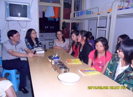 2010年9月9日晚8:00,我院党总支书记邱宏老师、常务副院长杨随军副教授、学生专干王会老师和新生本科班主任郑春老师前往A区我院本科新生寝室进行慰问走访。同时,党总支副书记赵政一教授、团总支书记刘薪老师和新生专科班主任张国平老师也到B区我院专科新生寝室进行了慰问走访。