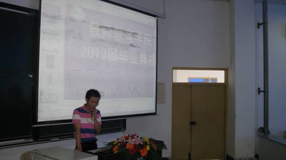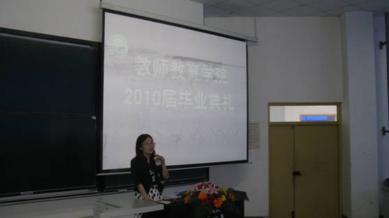 2010年6月9日下午2:30,教师教育学院在三教楼B座101教室隆重举行2010届毕业典礼。校党委副书记、我院院长刘維鸿教授、我院党总支书记邱宏同志、常务副院长杨随军副教授、党总支副书记赵政一教授、副院长李尚卫副教授、副院长何奎莲副教授、教师教育学院全体教职工、2010届毕业班全体同学以及非毕业生代表,共200余人参加了此次典礼。