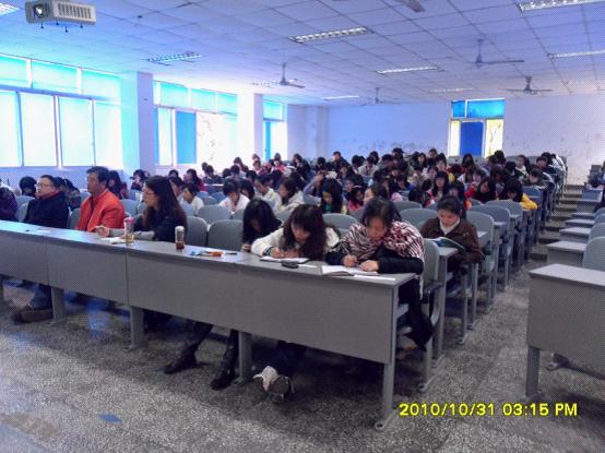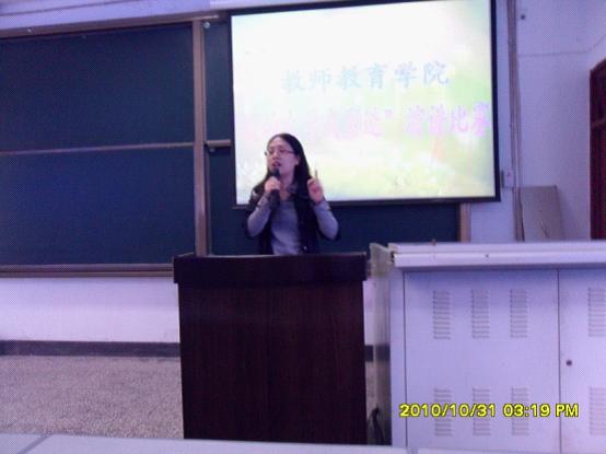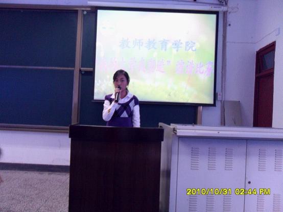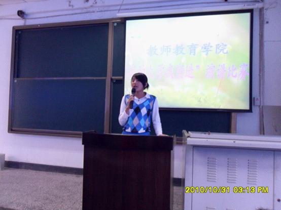 2010年10月31日下午2:30,教师教育学院在一教202教室举办了2010级“我的大学我塑造”演讲比赛。院党总支书记邱宏老师、党总支副书记赵政一教授、团总支书记刘薪老师、学生专职辅导员王会老师、郑春老师及10级5、6班班主任张国平老师作为评委出席了演讲比赛,2010级全体同学180多人参加了此次演讲比赛。
