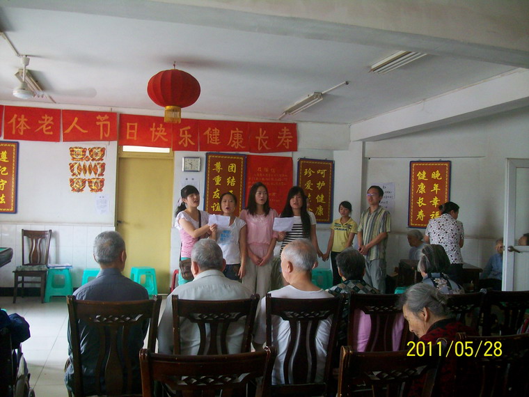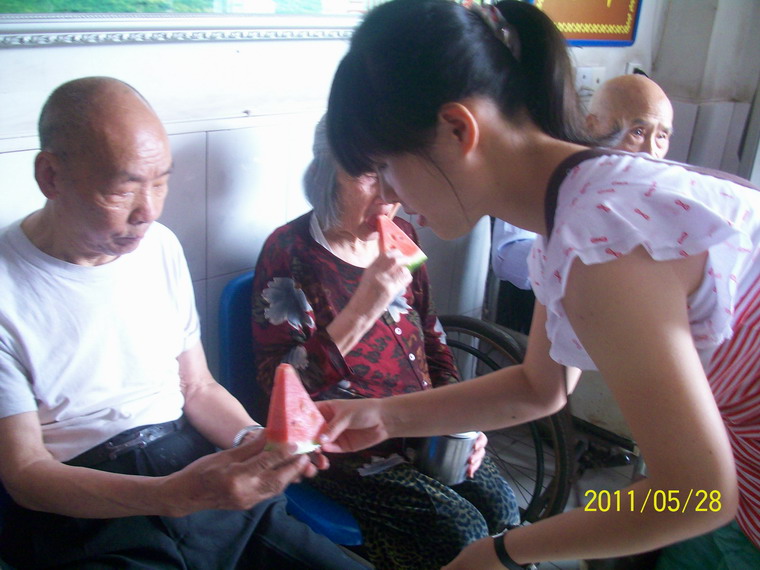 2011年5月28日早上9:00,我院青年志愿者队带上水果,甜点等来到康乐老年公寓看望公寓里的老人。