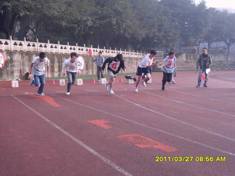 此次运动会分为田赛和径赛,田赛包括100米、200米、400米、4×100米接力赛等;径赛包括跳高、跳远、铅球、沙包等。参赛运动员热情高涨,全力以赴争取为所在院赢取荣誉。在各项比赛中,我院学生表现突出,为我院赢得了荣誉。在男子跳远比赛中, 10级1班的侯超同学入围前三名;在200米的比赛中,09级5班的吴靖心同学以惊人的速度,摘得女子200米的第一名;在1500米的长跑比赛中,10级4班的伍霖同学凭借自己的坚持和努力,取得了第一名的好成绩。田径场上比赛如火如荼,看台上欢呼声不断。在大家的期待下,最后一个环节是我院与化工院的友谊拔河比赛。在拔河比赛过程中不仅增进了彼此的交流,同时加强了两院的友谊。