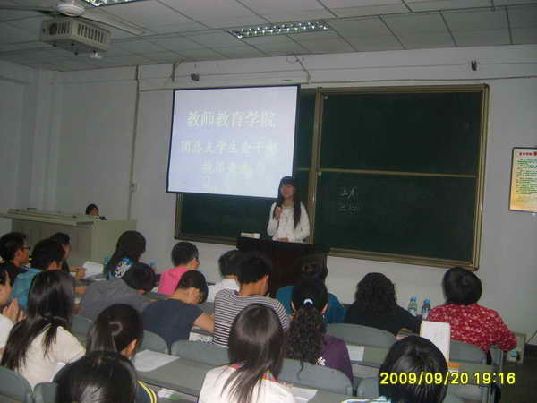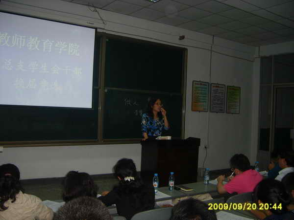 2009年9月20日晚上6:40,由我院团总支学生会主办的干部换届选举竞职演讲在一教楼201举行。我院党总支书记邱宏书记,常务副院长杨随军副教授,副院长李尚卫副教授,团总支书记刘薪老师,学生工作专职辅导员郑春、王会老师及各班班主任等作为评委出席了此次活动。