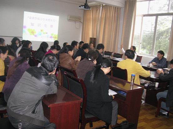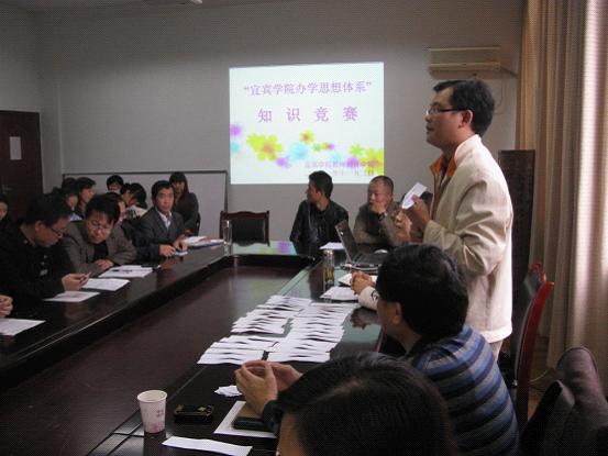 2011年11月2日下午,教师教育学院会议室气氛热烈,投影幕上鲜艳的“宜宾学院办学思想体系知识竞赛”两行醒目的大字清晰地跃入全体教职工眼帘,由教师教育学院党政工联合举办的知识竞赛即将拉开序幕。每位教职工积极响应党总支今年9月份发出的号召,认真学习、深刻理解学校在科学发展观集中教育活动中提炼的思想理论成果——“宜宾学院办学三大思想体系”。今天知识竞赛个个跃跃欲试,希望赛出优秀成绩。比赛的评委由教师教育学院党总支书记邱宏同志和常务副院长杨随军同志担任,邱宏书记在比赛前先向广大教职工讲明今天举办“知识竞赛”的重要意义和目的以及比赛规则。