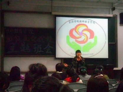 10月14日晚7点,为了充分践行学校大学生健康成长十个一工程系列活动,教师教育学院于一教201教室举办了首届班级文化建设主题班会。参加此次主题班会的有,教师教育学院党总支书记邱宏老师,教师教育学院副书记赵政一老师,教师教育学院办公室副主任汪贻文老师,学生工作办公室郑春老师,王会老师,程婷老师,巫晓娟老师,以及教师教育学院12级全体同学。