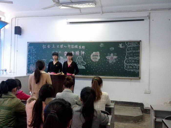 为了弘扬中华美德,让大家积极学习雷锋精神,2014年3月12日中午 13:30—14:10,教师教育学院在第一教学楼3楼和4楼的教室开展了以“社会主义核心价值观系列活动之学习雷锋精神”为主题的团组织生活。