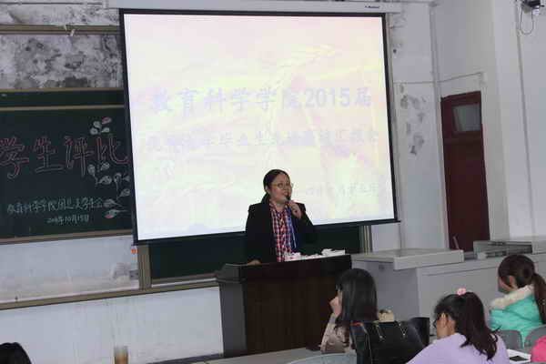 为了选拔出我院优秀大学生毕业生,教育科学学院于2014年10月15日下午在一教202开展2015届优秀大学毕业生评选会。出席本次评选会的领导和老师有:教育科学学院党总支书记邱宏老师,副书记赵政一教授,学生工作办公室副主任、团总支副书记郑春老师,专职辅导员程婷老师和巫晓娟老师。