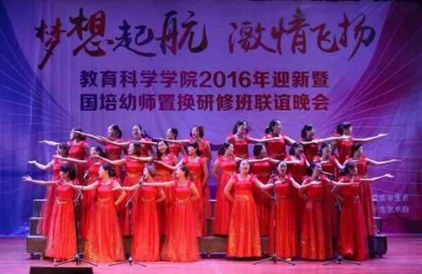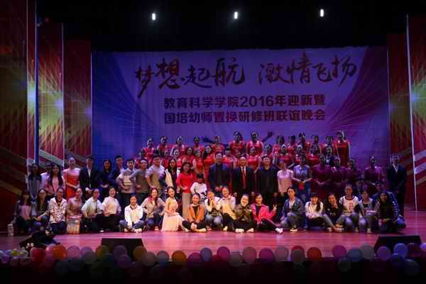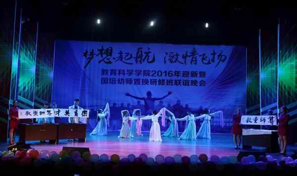 2016年10月16日晚7时许,由教育科学学院主办、团总支学生会承办、大学生艺术分团协办的“梦想起航,激情飞扬——2016年迎新国培幼师置换研修班联谊晚会”在三平台演播厅隆重举办。我院院长何会宁、党总支书记杨随军、党总支副书记赵政一及全体师生、国培学员参加了本次晚会。