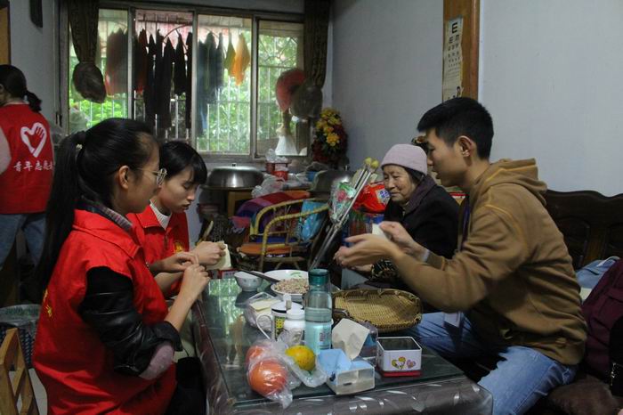上午10点40,志愿者们到达了阳光苑社区,老人们开心地欢迎志愿者的到来,大家一起进入老人家中,同学们有的为老人包饺子,打扫卫生,有的陪他们聊天、唱歌,耐心地听他们讲述过去的事情,温馨快乐的气氛在屋里蔓延开来……