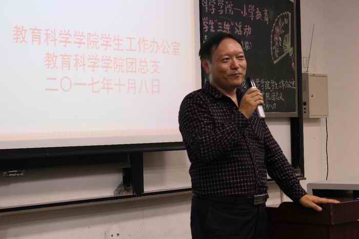 为了磨练青年大学生的意志,提高其身体素质,增强其专业技能,教育科学学院于2017年10月8日晚7时在三教A座202举行了“三练活动”启动仪式暨团队建设活动。教育科学学院院长何会宁、党总支书记杨随军、党总支副书记赵政一、学工办全体老师,教务办各专业教务秘书以及2017级全体新同学参加了此次活动。 启动仪式由赵政一副书记主持。