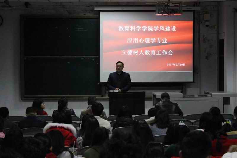 为了促进教育科学学院学风建设,树立“立德树人”的基本教育理念,2017年2月19日晚18点,教育科学学院于一教202召开了学风建设——应用心理学专业立德树人教育工作会。我院党总支书记杨随军副教授,院长何会宁教授,党总支副书记赵政一教授,副院长刘伟副教授,应用心理学系主任陈支那老师,教学秘书胡洁老师,辅导员程婷老师以及应用心理学13、14、15级全体学生参加了此次工作会。杨随军书记主持了本次会议。