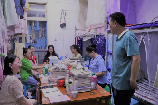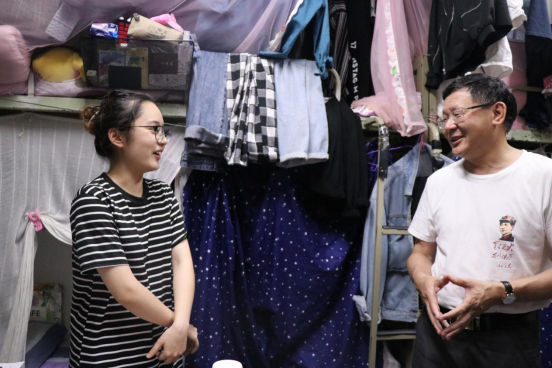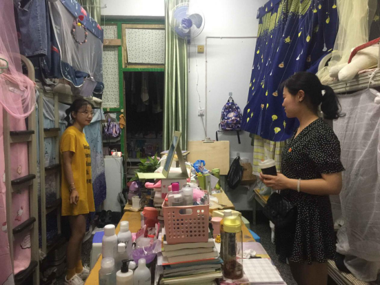 在领导和老师们走访过程中,发现女生寝室内务较为整洁,男生寝室环境有待改善。整体来说男女宿舍存在一些相通的用电问题:1、插板数量多且随意摆放;2、同时使用多种小功率的电器;3、插座靠近水源;4、寝室内东西较多较乱。学院领导以此向同学们强调宿舍安全、卫生、空间有效利用的重要性,反复叮嘱学生,要遵守学校的住宿规定,提高自身的安全意识,注意防火、防盗、寝室用电安全,同时老师们还与学生就关心各方面进行了面对面的亲切交谈。在本次走访过程中,欢声笑语的背后更是蕴含着领导和老师们对同学们的生活环境的关心与重视。