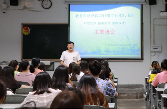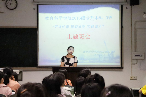 2019年6月2日晚7点20,教育科学学院在2016级专升本8、9班举行了以“严守纪律、勤奋好学、实践成才”为专题的主题班会,学院党总支书记杨随军、院长何会宁及辅导员王会老师出席了本次班会活动。
