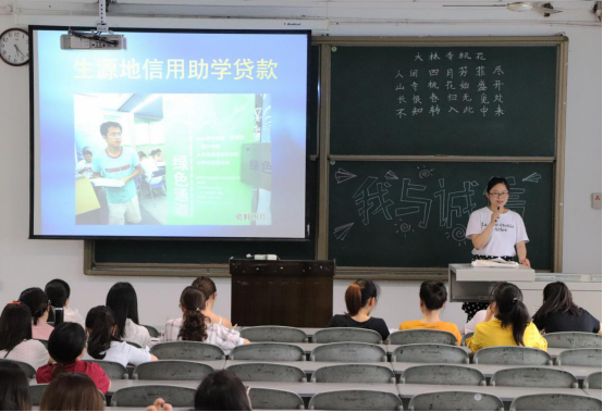 各班辅导员首先向同学们讲述高校家庭经济困难学生资助政策、国家助学金,奖学金的基本内容,同时也简要介绍了生源地信用助学贷款及还款相关事宜。其后以贷款员问诚信铸才为主题,向同学们宣讲诚信资助的重要性,希望同学们能“自立自强自力还款,诚心诚意诚信做人”。