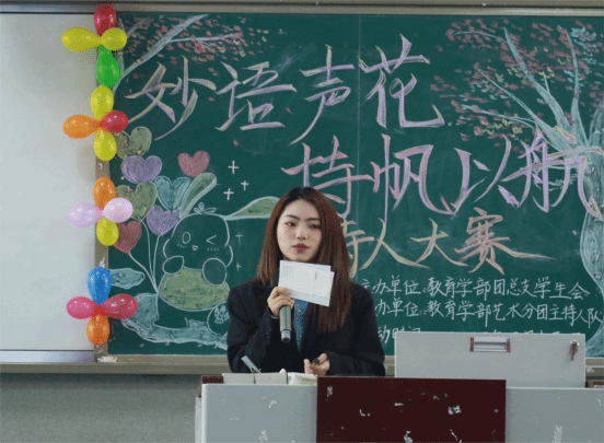 为深入学习贯彻习近平新时代中国特色社会主义思想,进一步提高师范生的专业素养与综合素质能力,展示我院学子的青春热情和自信风采,丰富校园文化,3月13日,教育学部在博雅楼b201开展以“妙语‘声’花·持帆以航”为主题的主持人大赛决赛。教育学部团总支副书记周然,学生会主席史岩、王馨颜、袁碧君、祝嘉琪担任本次活动评委。