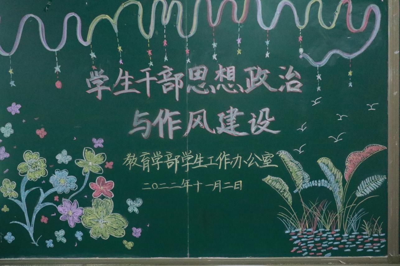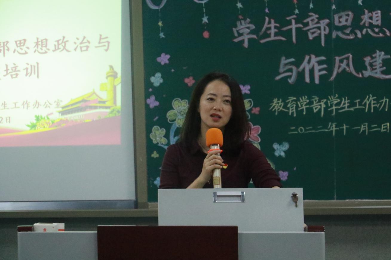 本次培训主题是“学生干部思想政治与作风建设”,刘薪书记用党的二十大报告精神统一学生干部思想,明确学生干部团队的发展方向,凝聚党后备军的力量,强调要培养德智体美劳全面发展的社会主义建设者和接班人。围绕党过去五年的工作以及新时代十年的伟大变革,刘薪书记结合工作经历和实例,强调培养学生干部要坚持正确的思想政治方向。她勉励全体学生干部要踔厉奋发,形成守正创新的新气象,及时反思,在思想与行动上走在前列,以崭新的面貌展现在学部全体师生面前,以扎实有效的执行力、创造力展现教育学部学生干部的魅力与担当!