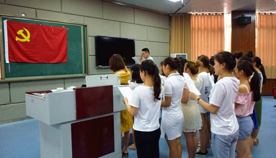 6月27日下午,教育科学学院党总支在艺术楼201举行2018年新党员入党宣誓仪式。党总支书记杨随军、党总支副书记赵政一、办公室副主任汪贻文、2017-2018学年度优秀共产党员邓玲、学生党支部书记薛肖飞、沈文静、程婷以及全体预备党员参加了此次宣誓仪式。仪式由党总支书记杨随军主持。