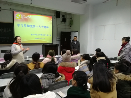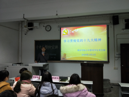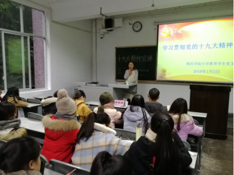 为更好地学习贯彻党的十九大精神,2018年1月3日下午,共青团宜宾市委宣讲小分队党的十九大精神宣讲座谈会在我院举行。团市委办公室主任陈炳秀、组宣部部长韩勋如分别进行了十九大精神宣讲。我院小学教育专业学生党支部党员、发展对象以及入党积极分子共计70余人聆听了宣讲。