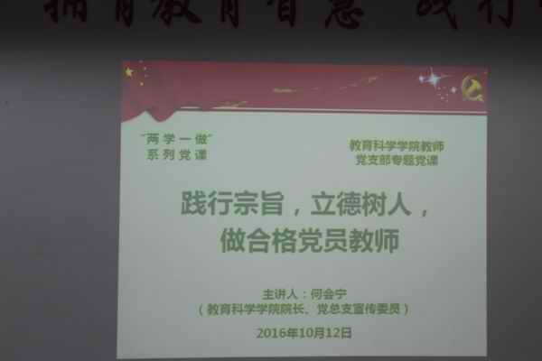 为深入进行“两学一做”学习教育主题“坚持根本宗旨,勇于担当作为”学习研讨,教育科学学院教师党支部于2016年10月12日15时在本院会议室(一教楼204室)开展了“践行宗旨,立德树人,做合格党员教师”的专题党课学习活动。专题党课由教育科学学院党总支宣传委员、院长何会宁同志主讲,教育科学学院教师党支部全体教职工党员认真听取了专题党课。