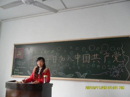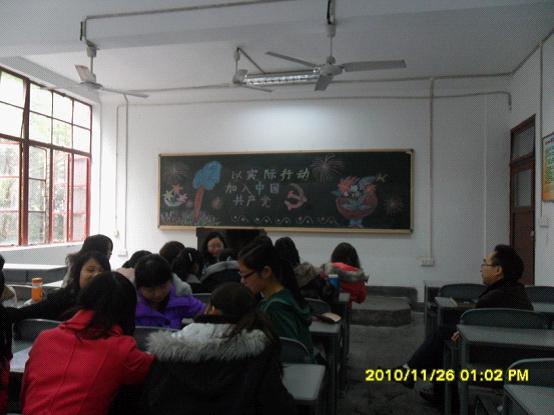 2010年11月25-26日中午12:50-13:50,我院第十九期入党积极分子党校学习的成员在一教楼206-210教室分别举行了主题为“联系实际,谈谈你对中国共产党的认识”以及“谈谈如何以实际行动早日加入中国共产党”的小组讨论会。我院党总支书记邱宏书记、副书记赵政一教授、副院长李尚卫副教授、团总支书记刘薪老师以及王会老师、曲燕老师等作为指导教师参加了此次小组讨论。