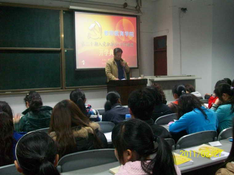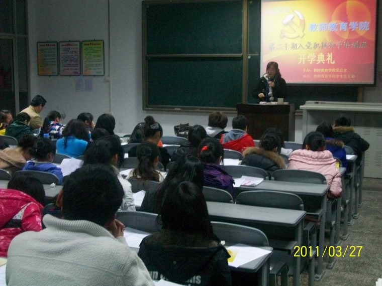 2011年3月27日晚7:20,由教师教育学院党总支主办的教师教育学院第二十期入党积极分子培训班开学典礼在一教楼202教室隆重举行。我院党总支副书记赵政一教授、团总支书记刘薪老师、学生专干郑春老师、10级5、6班班主任张国平老师以及09级10级的全体党员和本次参加培训班的学员参加了此次开学典礼。我院团总支书记刘薪老师主持了此次开学典礼。
