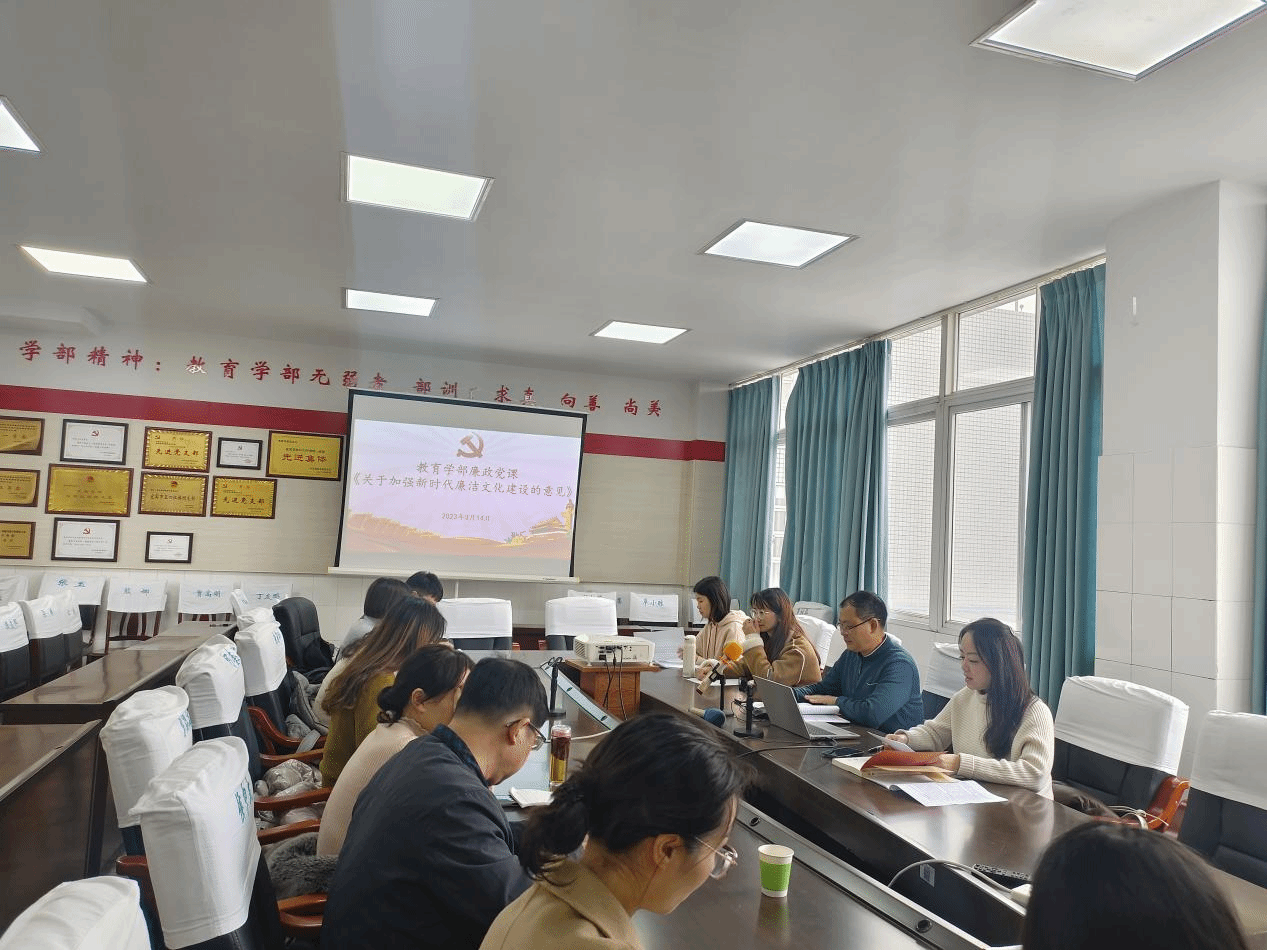 为深入学习贯彻《关于加强新时代廉洁文化建设的意见》的精神,进一步做好廉洁文化建设工作。教育学部党总支于3月14日开展廉政党课,会议由教育学部党总支副书记刘薪(负责工作)主持,全体行政人员参会学习。