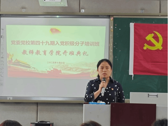 为深入学习贯彻习近平新时代中国特色社会主义思想,加强对入党积极分子的培养教育,进一步提升党员发展质量,把好党员队伍的“入口关”和“思想关”。10月10日,教师教育学院党委在博雅楼B201举行第49期入党积极分子培训班开班典礼,学院副处级组织员王蓉、党校班主任付蓉,各学生党支部书记、组织委员以及本期24名送培学员参加本次典礼。典礼由学生第一党支部书记王勤主持。