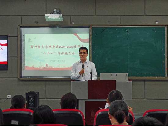 会上,教师教育学院党委书记刘薪向全体师生阐述“十个一”活动的目的和意义,她强调“十个一”活动不是孤立的党建任务,而是推动“党建与人才培养深度融合”的关键抓手。她希望全体党员干部和党员教师能够积极投身到活动中来,将“十个一”活动作为常态化工作来抓,确保活动取得实实在在的成效。