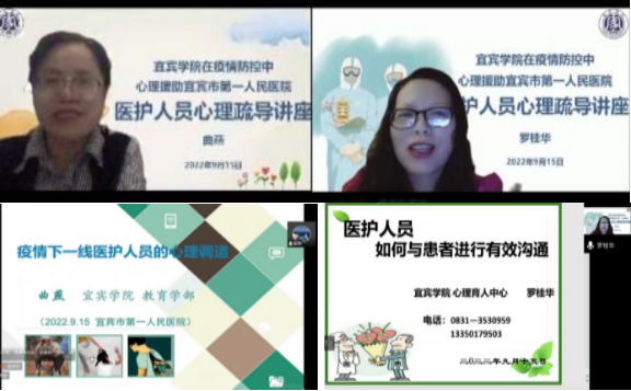 9月15日,应宜宾市第一人民医院的需求,宜宾学院疫情防控心理援助教职工志愿服务队和教育学部党总支组织了应用心理学系党支部书记曲燕副教授和心理育人中心主任罗桂华副研究员,通过视频连线方式,为宜宾市新冠肺炎患者定点救治的医院——宜宾市第一人民医院的130多名医护人员进行了心理疏导线上讲座。