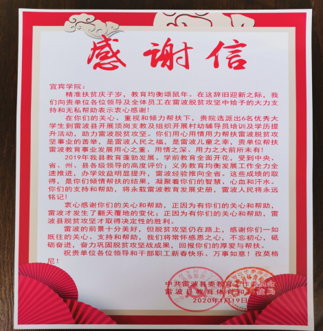 “精准扶贫庆子岁,教育均衡颂鼠年。在这辞旧迎新之际,我们向贵单位各位领导及全体员工在雷波脱贫攻坚中给予的大力支持和无私帮助表示衷心感谢!”“贵单位帮扶雷波教育事业发展用心之重、用情之深、用力之大前所未有。”“你们用心用情用力帮扶雷波脱贫攻坚事业的善举,是雷波人民之福,是雷波儿童之幸。”“你们的支持和帮助,将永载雷波教育发展史册,雷波人们将永远铭记。”