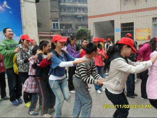 中午时分,志愿者们带着他们自己制作的贴画、剪纸以及糖果、铅笔等小礼物来到了培智学校。此次义务活动主要是采取上课的形式进行。每个志愿者都分到了各个班对培智学校的同学们进行一对一的辅导。志愿者们带着他们折纸,教他们辨图识字,和他们一起唱歌。丰富多彩的辅导内容让各位同学脸上洋溢起开心的笑容。志愿者们还在课间和各位同学们一起大跳《兔子舞》,玩起了各种游戏。操场上欢声笑语一片,好不热闹。