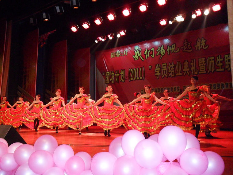 晚会上,国培置换班学员伴随着悠扬的钢琴声诉说着《友谊地久天长》,热情似火的西班牙《红裙舞》赢得热情的掌声,国培转岗班全体学员在整个演播大厅内上演的舞蹈《星星的心》更是让整个晚会达到了高潮,教师教育学院献上的舞蹈《茉莉花》、《六月清荷花》更是让人体会到了这春天的温暖。