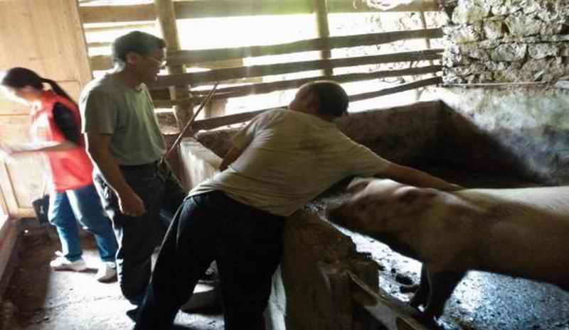 为节约时间,我们兵分两路。青队留下组织活动,杨书记一行五人在乡、村两级干部的陪同下赶往两户扶贫对象家中,检查项目落实情况,给他们带去了御寒衣服并高价收购了他们的红皮笋。看着凉嗮的衣服、打扫干净的庭院和圈里的肥猪,杨书记充分肯定了他们的改变,鼓励他们继续努力,勤劳脱贫。临走,杨书记还敦促他们赶快行动起来,着手三建三改项目,用自己的劳动争取政府的扶贫资金,改善居住环境。