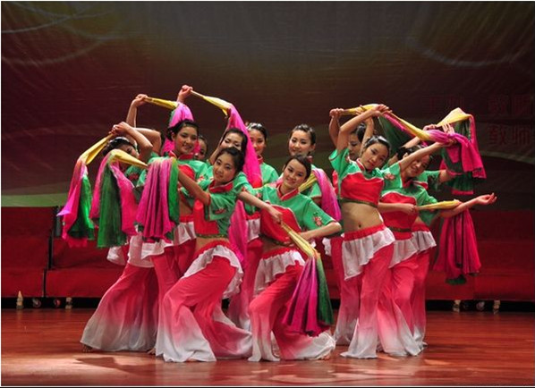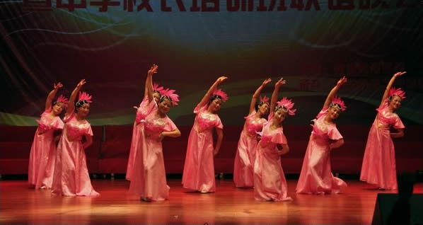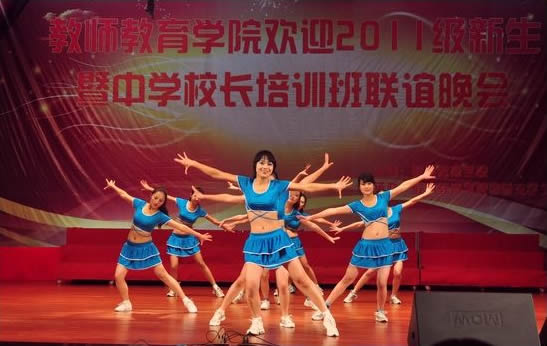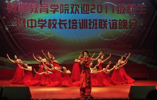 随着开场舞《SHOW ME》的音乐,此次晚会也拉开了帷幕。刘维鸿书记上台致辞,她代表学校党政领导对中学校长培训班的学习任务圆满结束表示衷心祝贺,对国培班学员到来表示热烈欢迎,对教师教育学院全体师生表示亲切慰问,对即将到来的2012年向大家祝福新年快乐。晚会正式开始,共安排了15个节目,由校大学生艺术团选送的歌伴舞《祖国万岁》其嘹亮的歌声响彻了整个演播厅,使全场的气氛顿时热闹起来。国培班学员带来了感人的诗朗诵《我是幼儿园教师》表达了她们作为幼儿教师对教育事业的热爱和忠诚。我院女教师们带来了精彩的舞蹈《桃花谣》,看她们粉色的衣衫摇曳,正像三月开得最艳的桃花。伴着欢快的节奏,教师教育学院的学生们跳起了舞蹈《打水姑娘》,她们活泼的舞姿尽显青春风采。杨随军院长和许家菱老师演唱的怀旧歌曲《雁南飞》和《采槟榔》将晚会气氛推向高潮,全场掌声不断。晚会节目丰富多彩,如舞蹈串烧、小品、拉丁舞、吉他弹奏等等。其中由教师教育学院来自五湖四海的学生表演的方言版诗朗诵《海燕》让人捧腹大笑的同时也让大家体会到中国语言文化的独特魅力。晚会期间观众们的掌声、欢呼声络绎不绝。最后在校长培训班带来的大合唱《友谊地久天长》的悠扬歌声中此次晚会圆满结束。