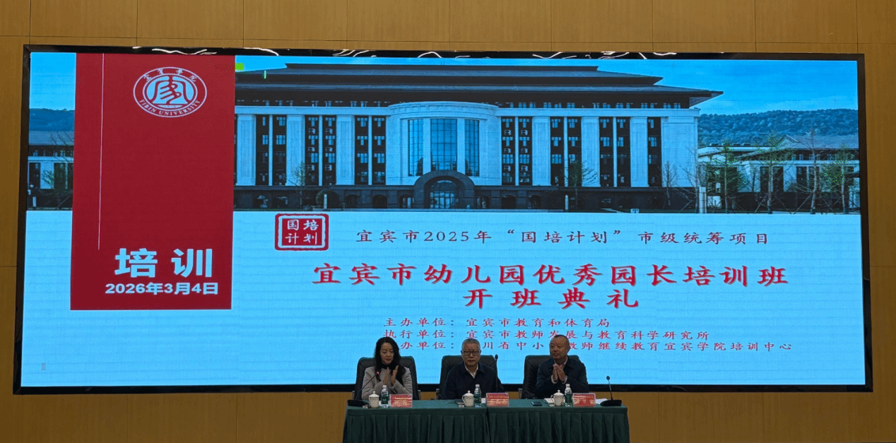 2026年3月4日上午,宜宾市2025年“国培计划”市级统筹实施项目优秀幼儿园园长培训班开班典礼在宜宾学院临港校区求实会堂隆重举行。四川省纪委监委驻宜宾学院纪检监察组组长、宜宾学院党委副书记、纪委书记徐其虎、教师教育学院党委书记刘薪、宜宾市国培计划项目执行负责人李万吉教授、培训班班主任及全体学员共同出席典礼。