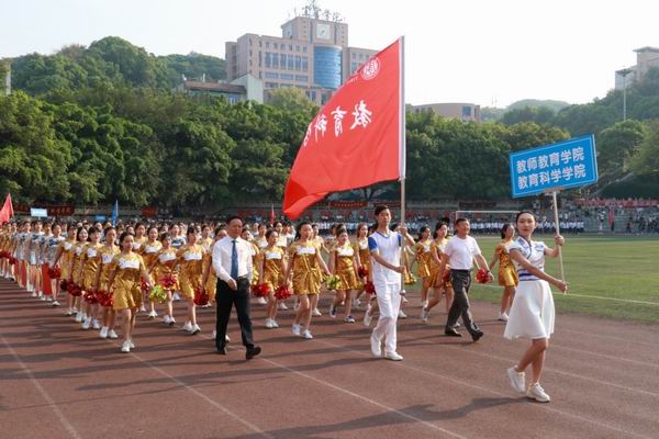 在党总支书记杨随军和院长何会宁的带领下,我院学生方队昂首挺胸地带着意气风发的面貌迈着整齐的步伐走向主席台,同学们身穿金色、银色的小短裙,手持彩球,展现出无限的青春与活力。“教科教科,亮点最多,转型发展,建设学科!”气势磅礴的口号回荡在运动场上,我院的方队在行走的过程中变换的队形让领导与观众们眼前一亮,摆出的“师”字更是代表着我们甘为人师的教育情怀。