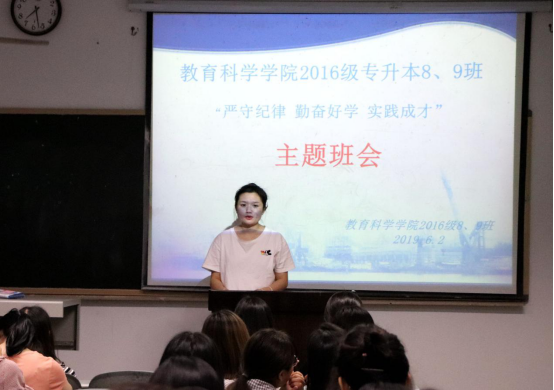 2019年6月2日晚7点20,教育科学学院在2016级专升本8、9班举行了以“严守纪律、勤奋好学、实践成才”为专题的主题班会,学院党总支书记杨随军、院长何会宁及辅导员王会老师出席了本次班会活动。