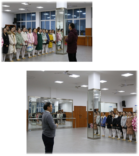 舞蹈汇报完毕师生整队,首先,叶静老师对本次汇报展示同学们的表现和不足之处作出了总结,对下学期的教学内容进行规划。其次,刘部长分享自身经历讲到:“跳舞就应该展示出我们的自信。”最后,何部长总结发言,肯定大家训练成果,表示看到同学们都在努力展现自己的风采而感到高兴。