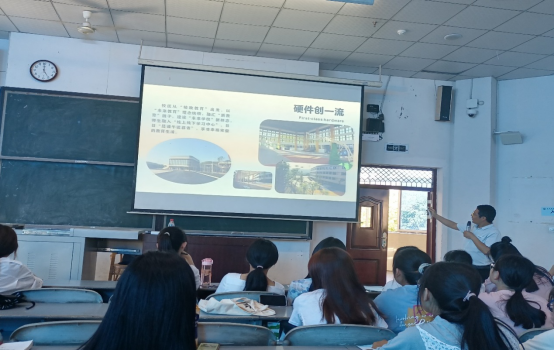 2021年6月4日下午,在宜宾学院第三教学楼B座302教室,宜宾市人民路小学岷江新区校区郑强校长为教育学部2020级小学教育专业的同学做了《活动育人,助力宜宾“未来学校”建设》的专题讲座。郑校长的讲座围绕五个方面来展开:一、自我介绍。二、学校硬件和场景教育。三、信息即力量。四、活动即生长。五、精致走向未来。郑校长以人民路小学岷江新区校区建设为例,对这些方面进行了详细的介绍及讲解。