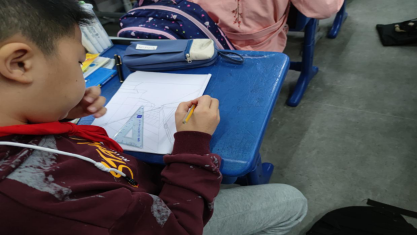 其次是美术课,美术课则有更大的乐趣,美术彭老师专业知识扎实,每一个知识点都讲得精彩透彻,学生们的反馈也非常积极,在讲到透视这一知识点时,学生们很多不太能理解,彭老师立马给出了精彩的示范,并且引导学生通过手边已有工具进行辅助绘图,很多学生立马拿起了三角板进行透视结构绘制。