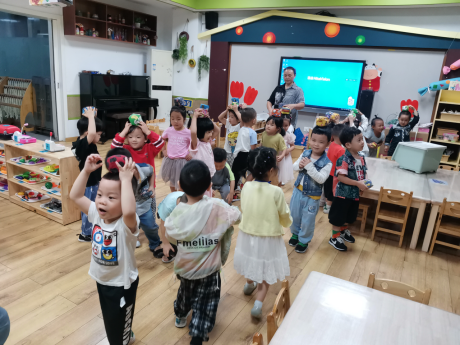 活动开始前一天,袁老师就将游戏规则和示范动作都展示给了小朋友,并请全班小朋友们都参与尝试。今天活动前袁老师也再次重复了规则和动作。